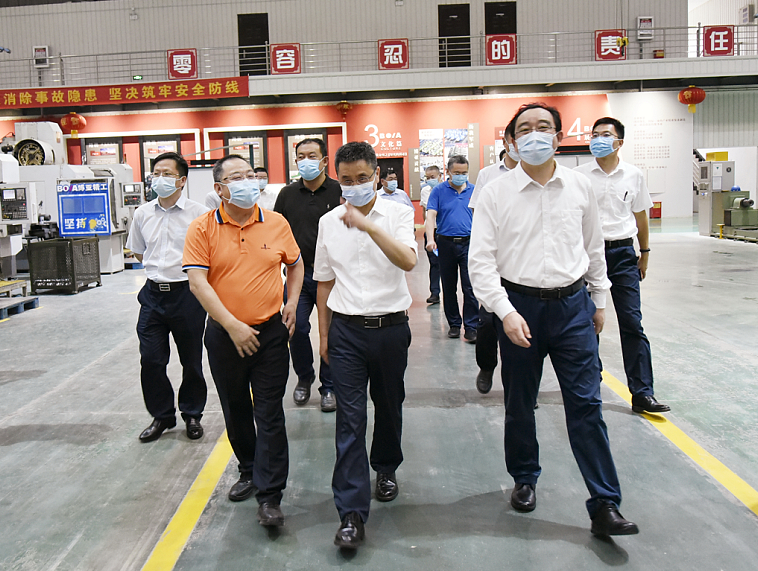 王市長一行先后走進特裝生產車間、再制造及精沖機維修車間(A1車間),實地查看一線疫情防控和生產經營情況,詢問了解公司發(fā)展狀況,并在A1車間舉行座談,詳細聽取李總的工作匯報。