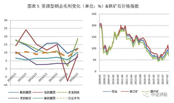 資源型鋼企的毛利率變動(dòng)與鐵礦石價(jià)格的變化趨勢(shì)一致,2013年之后受全球尤其是中國(guó)鋼鐵產(chǎn)能過(guò)剩影響鐵礦石價(jià)格快速下行,資源型鋼企的毛利率進(jìn)而惡化,且惡化趨勢(shì)要顯著大于行業(yè)平均水平。2016年下半年鐵礦石價(jià)格的回暖也帶動(dòng)資源型鋼企毛利的恢復(fù)。