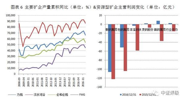 但從中長(zhǎng)期來(lái)看,資源型鋼企歷史上的相對(duì)競(jìng)爭(zhēng)優(yōu)勢(shì)已愈發(fā)不明顯,首先隨著國(guó)外淡水河谷、必和必拓等主流礦企2013年之前新建優(yōu)質(zhì)鐵礦的持續(xù)投產(chǎn)以及隨著國(guó)內(nèi)廢鋼累積率逐步提升對(duì)鐵礦石的替代作用不斷加強(qiáng),鐵礦石市場(chǎng)供求將逐漸步入買方市場(chǎng),國(guó)內(nèi)鐵礦石的品味和成本劣勢(shì)將越發(fā)明顯,資源型鋼企長(zhǎng)期依賴的競(jìng)爭(zhēng)優(yōu)勢(shì)或轉(zhuǎn)化為劣勢(shì)。從鐵礦石價(jià)格的變化趨勢(shì)可以看出,鐵礦石價(jià)格在2016年下半年持續(xù)回升,但已難以恢復(fù)到前期平均水平。本輪鋼鐵行業(yè)周期性回暖背景下,資源型鋼企盈利狀況的恢復(fù)明顯弱于行業(yè)平均。