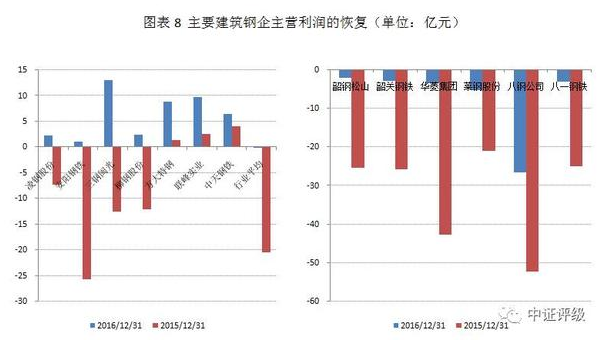 行業(yè)內(nèi)主要建筑鋼企主營(yíng)利潤(rùn)增幅明顯,遠(yuǎn)高于鋼鐵行業(yè)的整體平均值。但建筑鋼材市場(chǎng)的回暖呈現(xiàn)一定區(qū)域性分化,部分建筑鋼企2016年主營(yíng)利潤(rùn)仍然虧損,但相較2015年也實(shí)現(xiàn)大幅減虧。